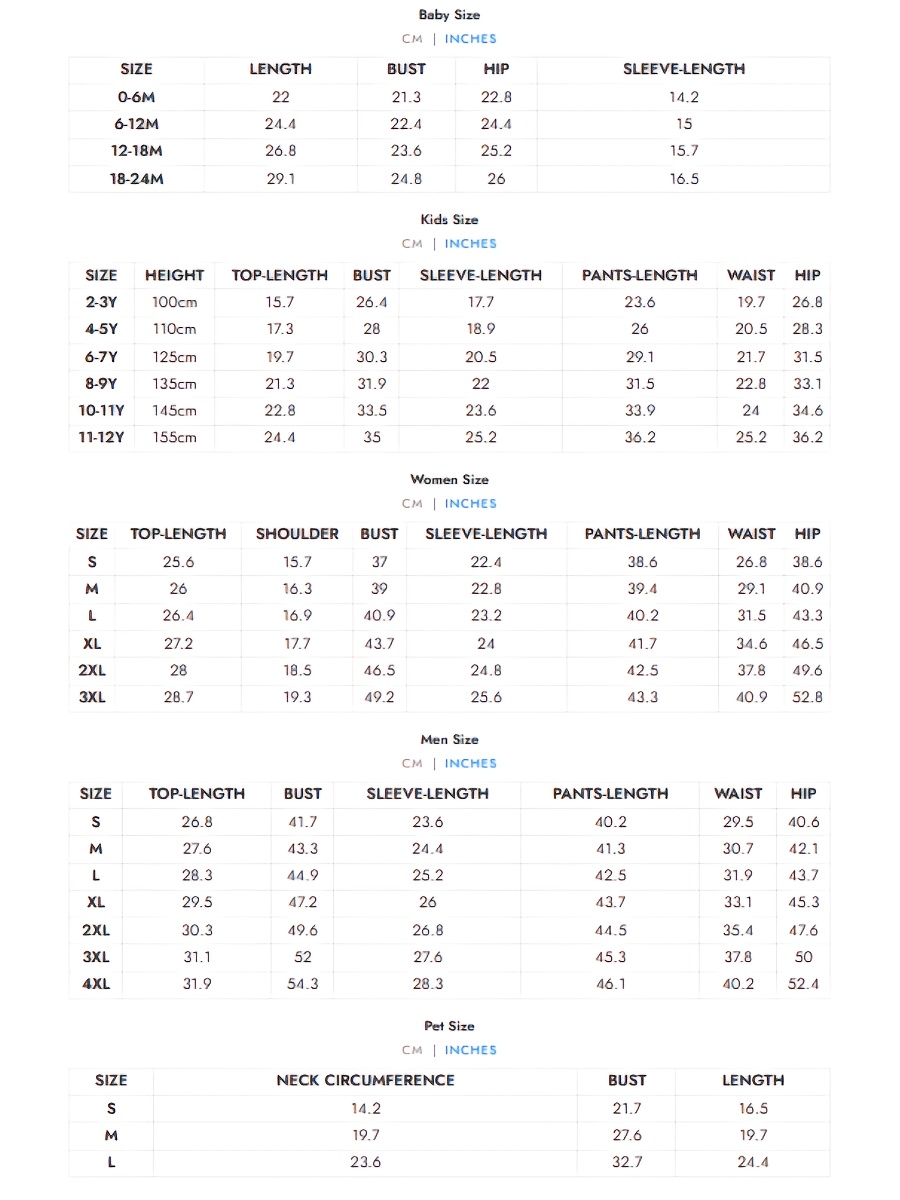 Sizes for women, men, and children consist of a top and pants, forming a two-piece outfit. The baby size is available as a single-piece onesie. For dogs, the size includes a pet bandana.